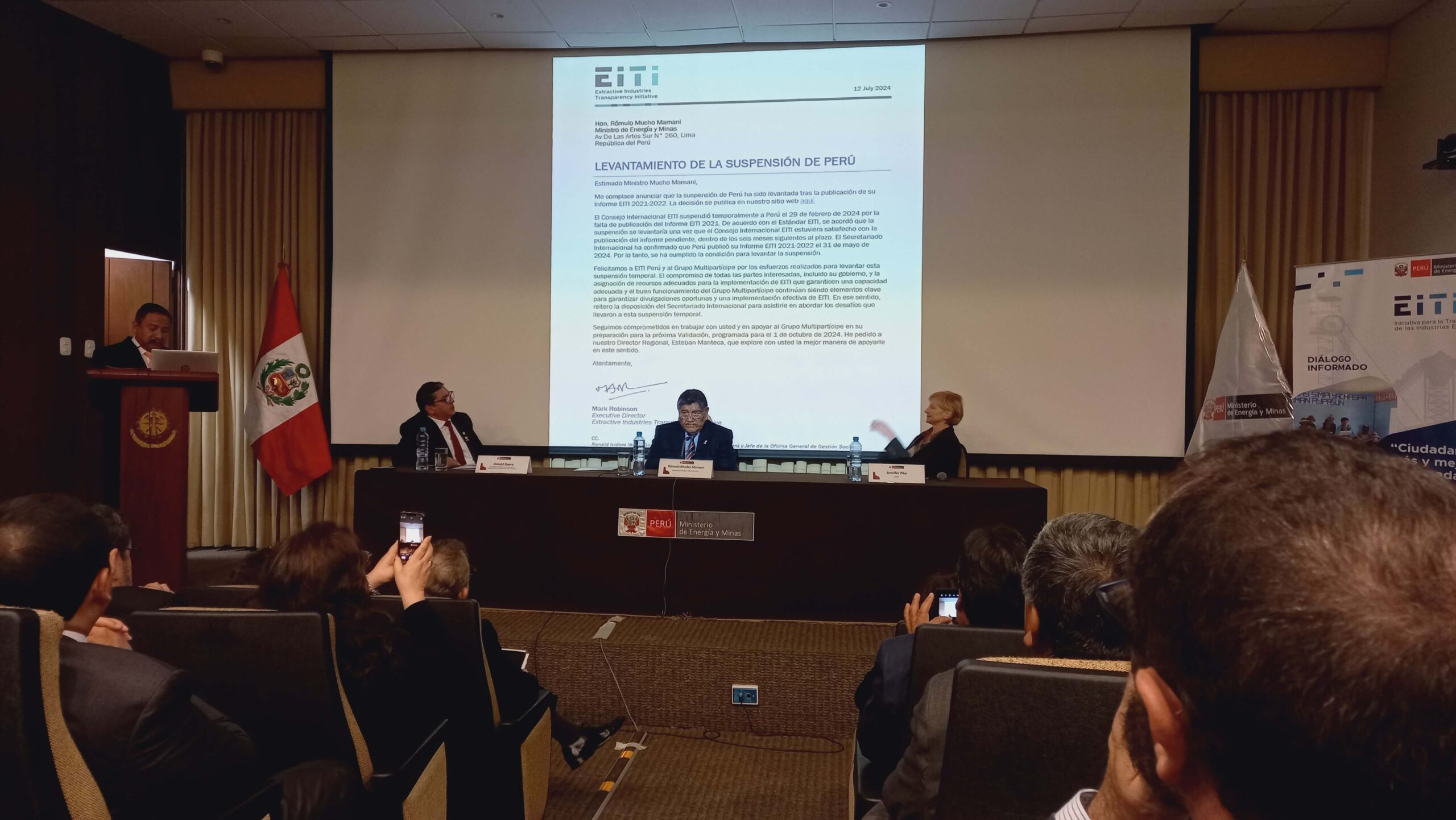 La publicación de informe permitió además la reincorporación del Perú al EITI, iniciativa mundial de transparencia en el sector extractivo, tras la suspensión temporal en diciembre del 2023, impuesta por el Secretariado Internacional del EITI. Esta noticia la dio a conocer, el propio ministro del MINEM, Rómulo Mucho. “Tenemos el gusto y agrado de anunciar que hemos recuperado nuestra condición de País Cumplidor en esta importante plataforma mundial, en la cual participan países de todo el mundo y que es un soporte fundamental para la meta que tenemos como país en la OCDE”.