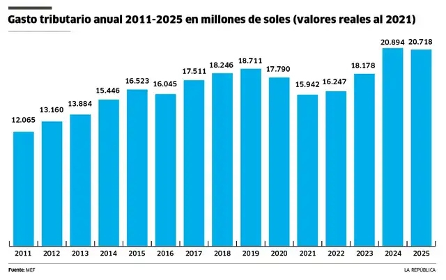 El crecimiento de estos beneficios se refleja en la evolución del gasto tributario, es decir, los ingresos que el Estado deja de percibir por exoneraciones y tratamientos especiales, que ha mostrado una tendencia sostenida al alza en los últimos años. Según el informe, este pasó de S/12.065 millones en 2011 a S/20.718 millones en 2025 en términos reales, con un salto más pronunciado a partir de 2023, en línea con el actual periodo legislativo.